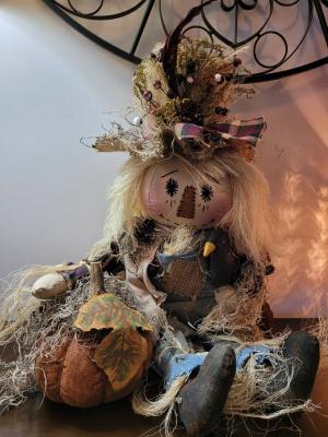 Primitive large Scarecrow Fall Doll Handmade Pumpkin Pip berries Crow