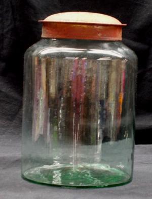 ANTIQUE/VINTAGE STYLE GREEN TINTED STORAGE JAR WITH DISTRESSED RED TIN LID NEW