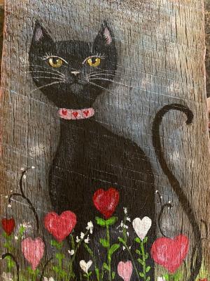 PRIMITIVE FOLK ART PRIM HP VALENTINE BLACK CAT RECYCLED RECLAIMED BARN WOOD
