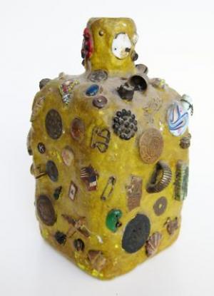 Antique Primitive Folk Tramp Art Memory Jar Jug Bottle Trinkets Gold Pins