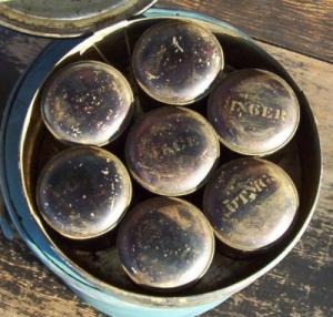 ANTIQUE TIN CONTAINER WITH 7 ROUND SPICE CANS. !!!