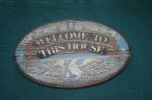 ANTIQUE PRIMITIVE OLD OVAL WELCOME TO THIS HOUSE SIGN FOLK ART EAGLE WOOD FRAME