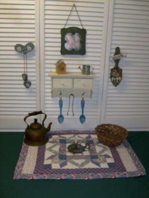 *~PRIM. COUNTRY KITCHEN GATH. # 6 :QUILTED COVER, WOOD SHELF,OL' COPPER TEAPOT++