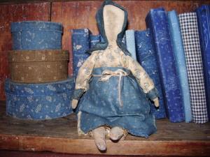 Early Antique Style Primitive Prairie Rag Doll Dressed in Blue Fabrics