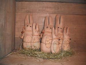 3 PRIMITIVE RABBIT DOLLS OLDE QUILT EGG TUMMY 3 BABY BUNNIES VANILLA BAKED