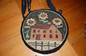 PAIR OF PRIMITIVE SALTBOX HOUSE & SUNFLOWERS HOOKED RUG CHAIR PAD