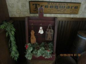 PRiMiTiVe OLDe SNOWMAN DOLL and SNOW BABY ViNTaGe ReD QuiLT DReSS CuPBoaRD TuCK