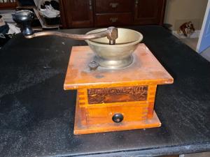 ANTIQUE WOODEN CAST IRON COFFEE GRINDER DOVETAIL CORNERS DRAW