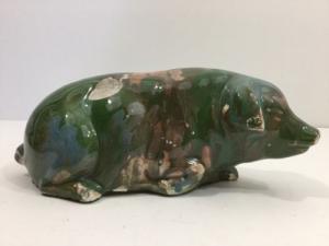 Nice Antique English Mochaware Folk Art Pottery Resting Pig Bank In Green Glaze