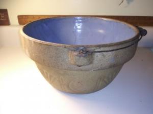 RARE LARGE MOON FAN ANTIQUE PRIMITIVE STONEWARE BOWL BALE WIRE HANDLE 12IN.