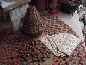 Old Primitive Vintage 1920s Italian Bingo Tombola Game Wood Pieces Cards Basket