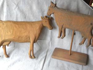 Old Folk Art hand carved wooden cow figures signed dated primitive antique farm