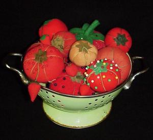 ENAMEL COLANDER w TOMATO PIN CUSHIONS Vintage KITCHEN DECOR COLLECTION noRESERV