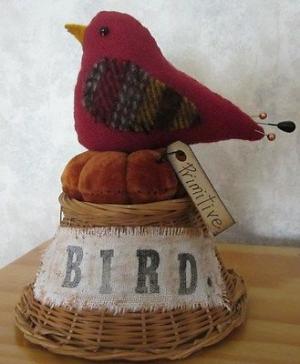 PRIMITIVE WOOL RED BIRD WICKER BASKET MAKE DO PIN CUSHION PFATT