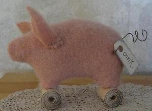 PRIMITIVE WOOL PIG HOG MAKE DO DOLL SHELF SITTER SPOOL WHEELS TOY PFATT