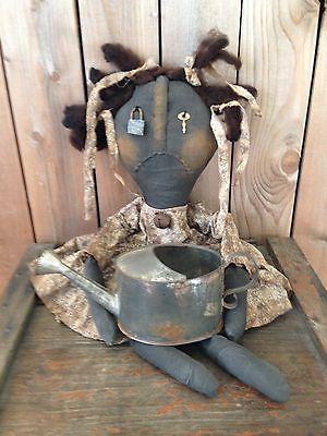 Primitive Black Folk Art Doll w Watering Can Tin Rusty Grungy Lambs Wool Hair