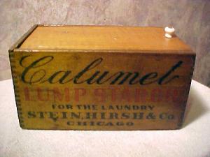 1900-1940 advertising dovetailed wooden box, Calumet Lump Starch for the Laundry
