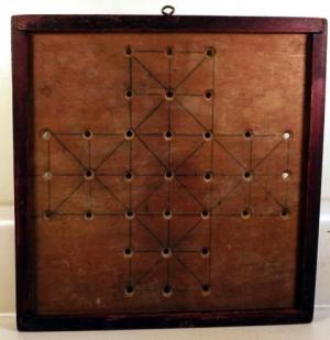 Antique Vtg Homemade 10x10" Wooden Game Board Played w Pegs or Marbles c1940s