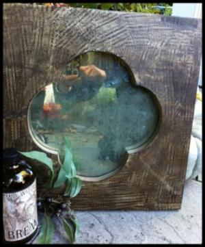 Antique PRIMITIVE Beveled Glass DIAMOND Shape MIRROR Easel ~ PATINA Chip Cut
