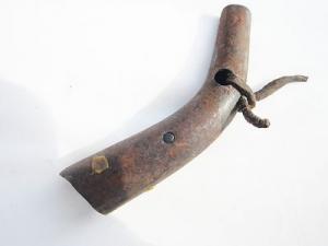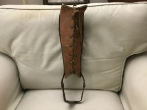 EARLY ANTIQUE PRIMITIVE LEG BRACE. LEATHER & METAL