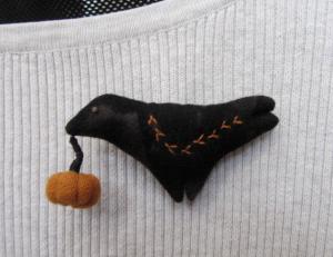 Primitive Folk Art Hand Dyed Wool Crow-Bird+Dangle Pumpkin Brooch/Pin Ornament