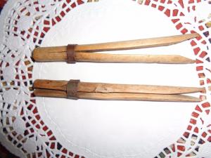 (2) Antique Hand Made Wood with Metal Collar Clothes Pins Primitives