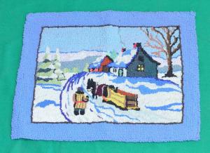 WINTER - Folk Art Hooked Throw Rug Hand Made Primitive Country Cottage- Antique
