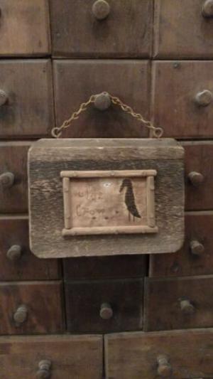EARLY PRIMITIVE HAND STITCHED SAMPLER OLDE CROW SIGN RUSTY CHAIN HANGER