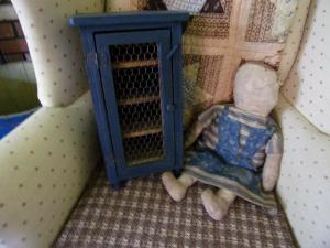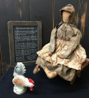 Primitive Early Prairie Doll with Dreamy Milk Maid Slate and antique chicken..