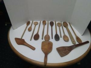 LOT OF 15 ANTIQUE VINTAGE PRIMITIVE OLD FARMHOUSE WOOD SPOONS,PADDLES,SPATULA