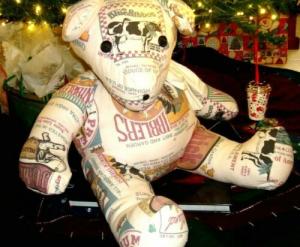 PRIMITIVE FEEDSACK SEEDPACK AMERICANA PATCHWORK TEDDY BEAR LARGE APRROX 15"X20"