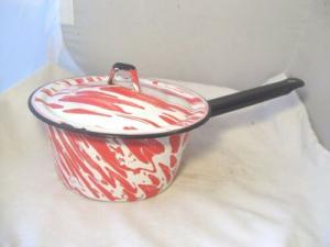 OLD ORIGINAL, FAIRLY RARE RED AND WHITE SWIRL GRANITE WARE 1QT. SAUCE PAN W/LID