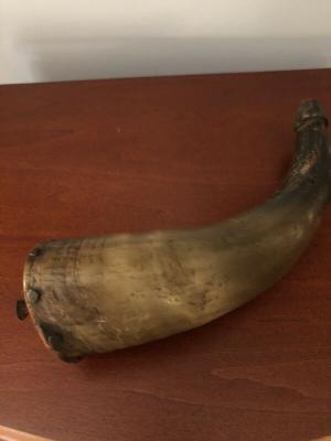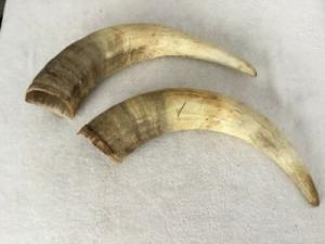 TWO Old Child's Wood Original Paint Horns Blue Mustard Red Great Find Bargain