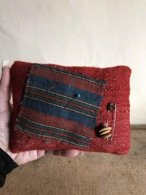 Antique Inspired Linsey Woolsey Turkey Red Blue Pin Cushion Bone Buttons AAFA #2