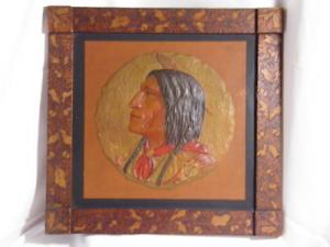 Antique Primitive Wood Burned Frame with Picture of Native American in Relief