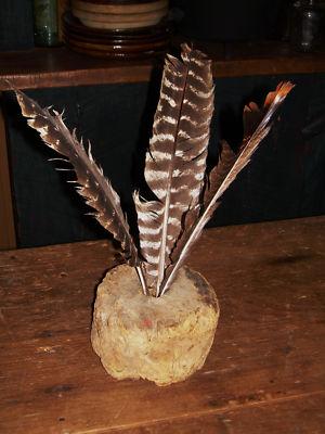 MAKEDO QUILL HOLDER 3 TURKEY FEATHERS TAVERN LOOK EARLY ANTIQUE OLD PRIMTIVE