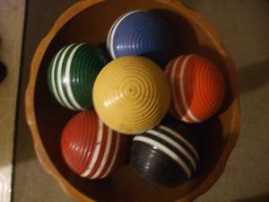 6 VINTAGE CROQUET BALLS WOODEN RIBBED MULTI COLORED w/ STRIPES *COLLECTIBLE*
