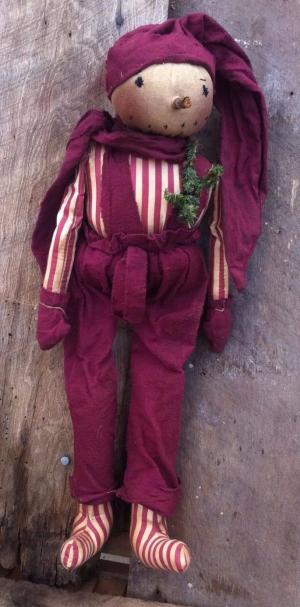 Sweet Primitive Snowman doll overalls gloves Christmas Winter Burgundy Winter