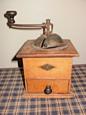 ANTIQUE COFFEE GRINDER, WOOD & IRON Le Broyeur, FINGER-JOINT CONST