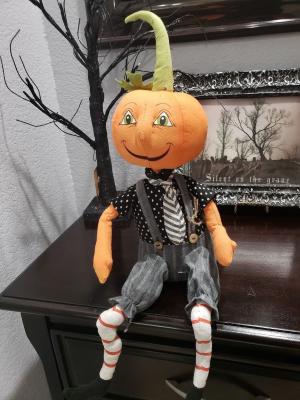 Halloween Primitive Folk Art Rag Doll Pumpkin Head Shelf Sitter Tabletop Decor