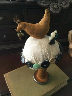 EARLY PRIMITIVE HANDMADE BIRD PINCUSHION ON WOOD SPOOL