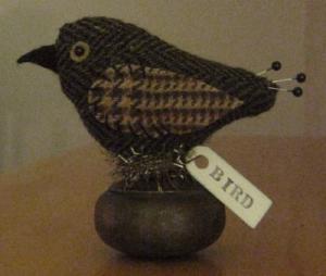 PRIMITIVE TWEED WOOL BIRD MAKE DO PIN CUSHION ON ANTIQUE DOOR KNOB HEART PFATT