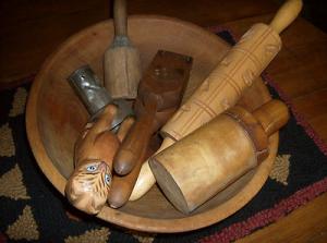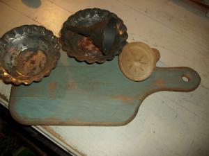 ANTIQUE PRIMITIVE CHOP BOARD/PUDDING/ TART TINS/ BUTTER PRESS/FUNNEL AAFA