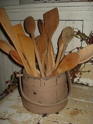 Vintage Primitive Wood Wooden SUGAR FIRKIN Bucket Pail w/Wood Spoons&Spatulas