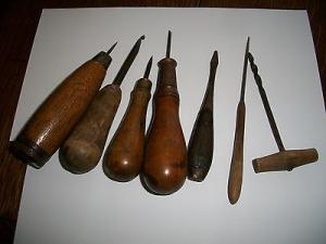 7 Antique vintage primitive tools w/wooden handles. Screwdrivers, awls, hooks