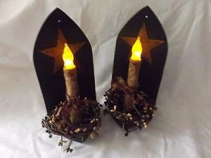 SET OF 2 PRIMITIVE RUSTY STAR WOOD SCONCES WITH TIMER CANDLES & PIP BERRY RINGS