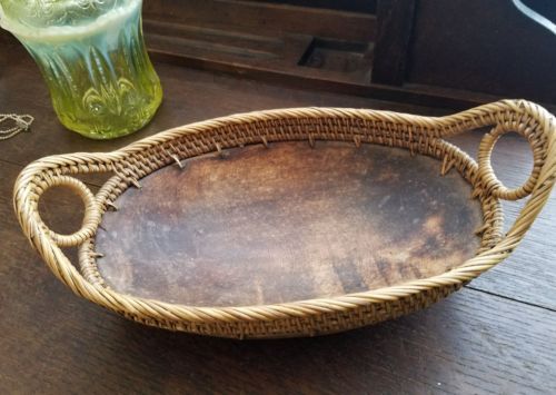 Hand Carved Wood & Woven Dyed Grass Bread Basket Primitive Rustic Bowl Decor ***