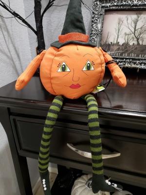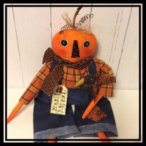 Halloween Primitive Pumpkin Head Fabric Shelf Sitter Rag Doll 22" Cute!