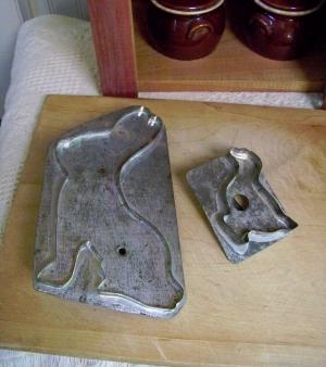 Primitive 2 tin cookie cutters Lg Bunny and Sm Duck soldered handles tarnished
