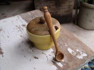 Vintage Primitive Stoneware Mustard Pot With Antique Carved Wood Spoon